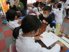 11月25日(土)に名護市中央公民館にて、今年も「お仕事体験~やんばる☆きらりん~」が開催されました。このお仕事体験は、やんばる地域の小中学生親子を対象に名護市PTA連合会が主管となって開催される体験事業です。当会は、薬剤師業務を体験できるブースを出展し、お菓子・ジュースを錠剤・シロップ剤に見立てて、分包やシロップ混合などの業務体験を行いました。当会からは薬剤師7名が講師として参加し、計48名の子ども達が薬剤師業務を体験し、当会ブースは大盛況でした。
